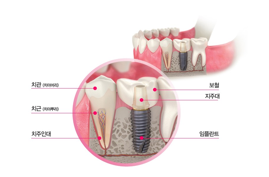 - (보철물 장착) 시술의 마지막 단계로 지대주 위에 인공치아를 끼우게 됨