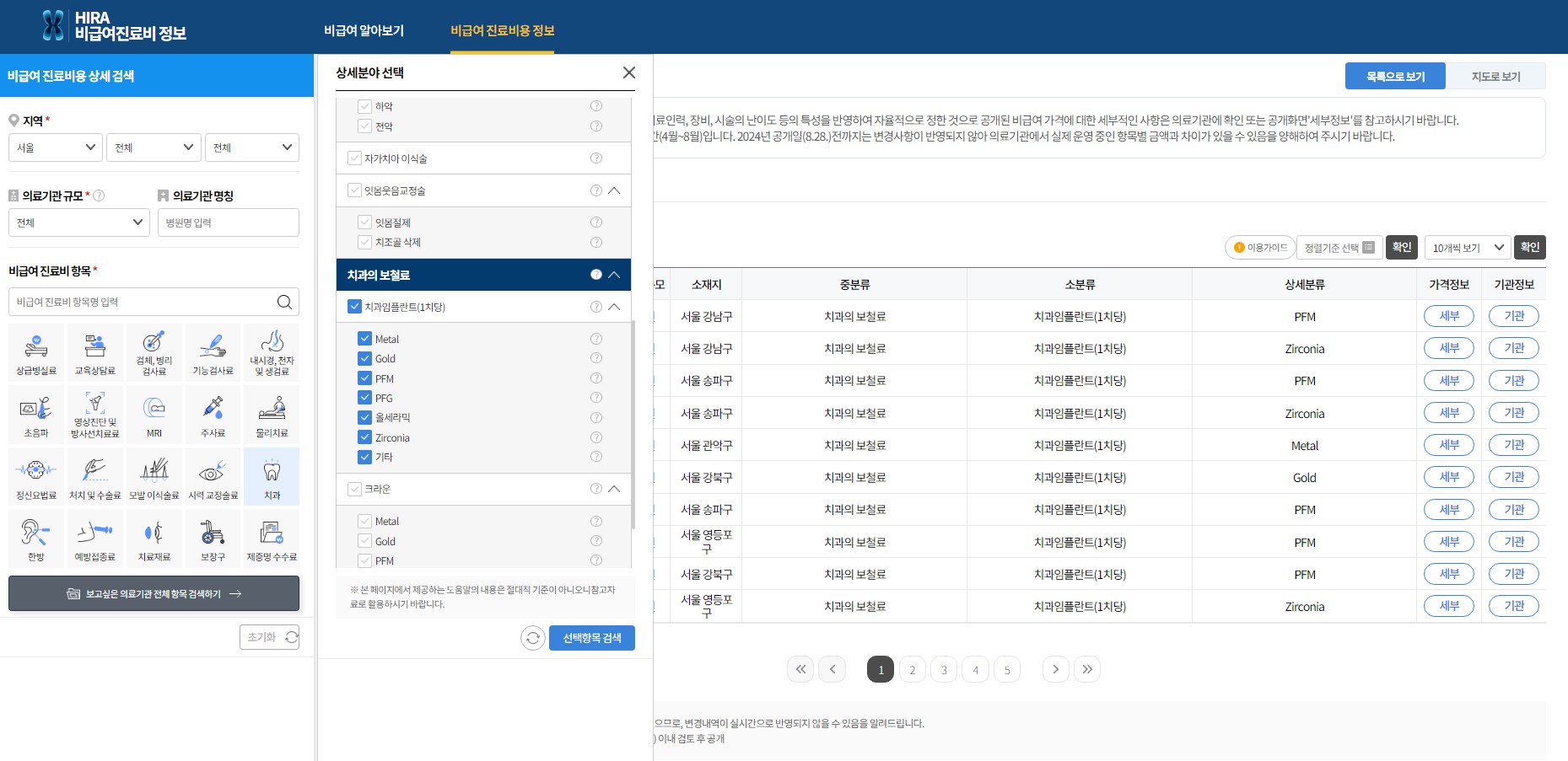 - 치과 선택 후, 활성화된 상세분야 선택에서 치과임플란트(1치당) 메뉴를 선택하여 선택항목 검색